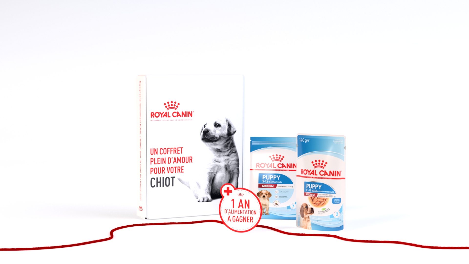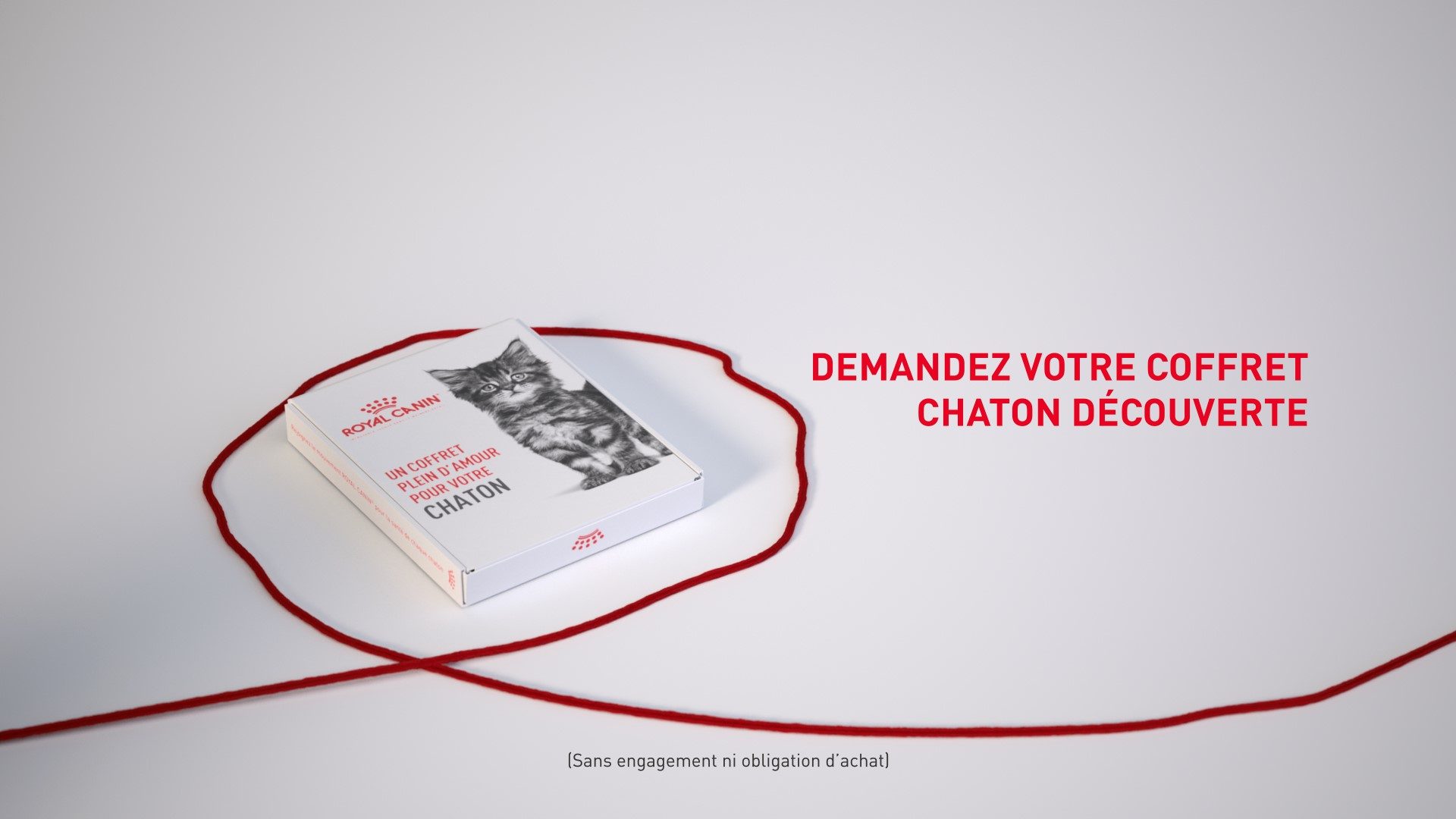 Sur les emballages Royal Canin, un fil de laine rouge est souvent présent, pour être plus ludique et ramener une touche de rouge. Dans notre première esquisse animée, nous avons envisagé de l’utiliser comme un fil conducteur voyageant à travers les différents éléments du coffret. Au final le fil reste mais non animé.